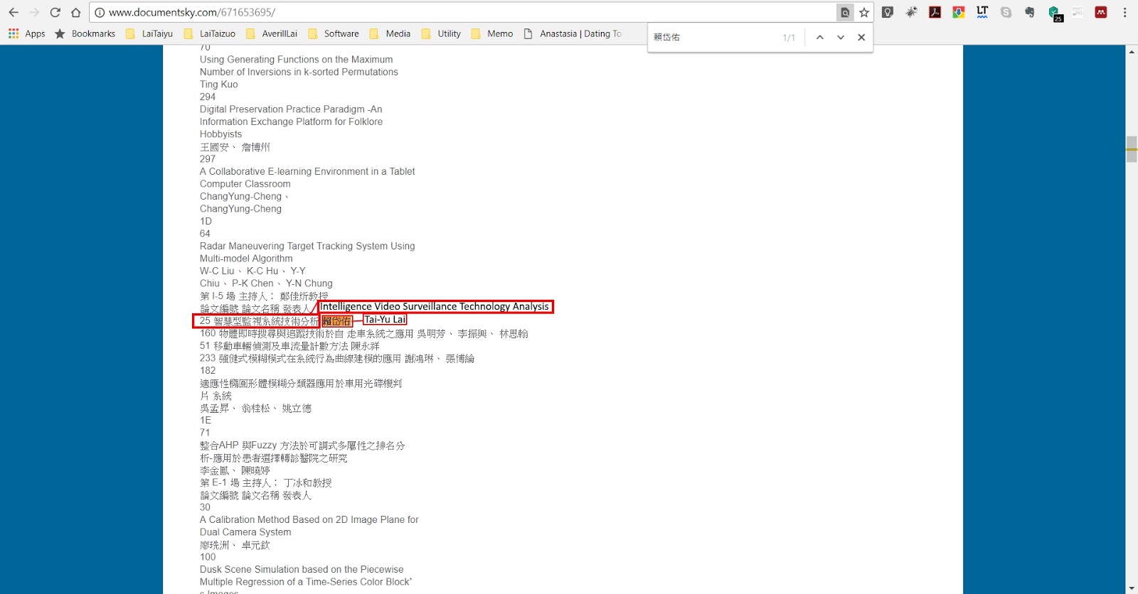 - Tai-Yu Lai, "Missing and Unattended Object Detection Algorithm in the Complex Background," Traditional Chinese Edition, 12th Taiwanese Association for Artificial Intelligence, Yulin, Taiwan, 16th November 2007 ~ 17th November 2007.